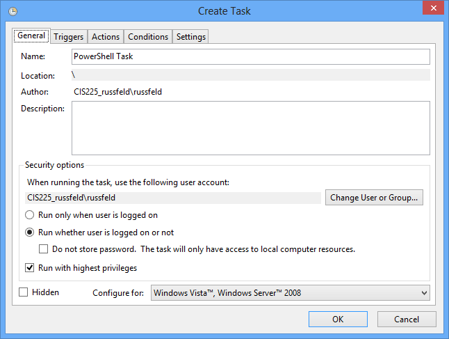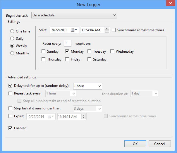 m h dom mon dow15 5 * * 0 5:15 AM every Sunday (0)*/10 8 - 16 * * 1-5 every 10 min 8AM - 5PM weekdays0 0 1 1 1 run at 12:00 AM every January 1 and every Monday@reboot run once, after system startsPowerShell Menu