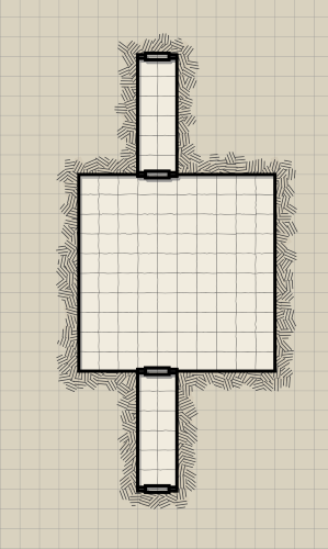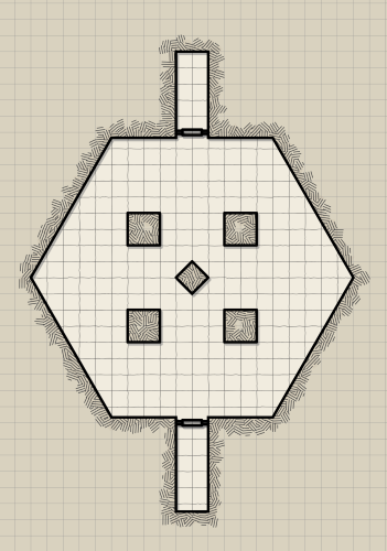 The room that it opens to is 50 feet by 50 feet, or 10 by 10 squares. The ceiling is very tall, 20 feet or more, and once again there are a large number of torches providing ample light. However, the party should quickly notice that there are four torches above the center of the room that burn with what appears to be a magical color. Something is maintaining that fire beyond just burning wood and oil.